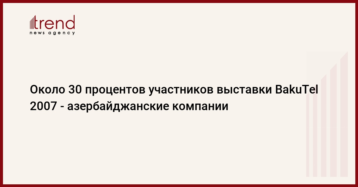 Азербайджан, Баку /корр. Trend С.Бабаева/ Около 30 процентов участников 13-й международной выставки-конференции "Телекоммуникации и информационные технологии - BakuTel -2007" являются азербайджанскими компаниями. Об этом сообщила во вторник менеджер компании Iteca Caspian LLC (организатор выставок) по выставке Рена Абуталыбова.