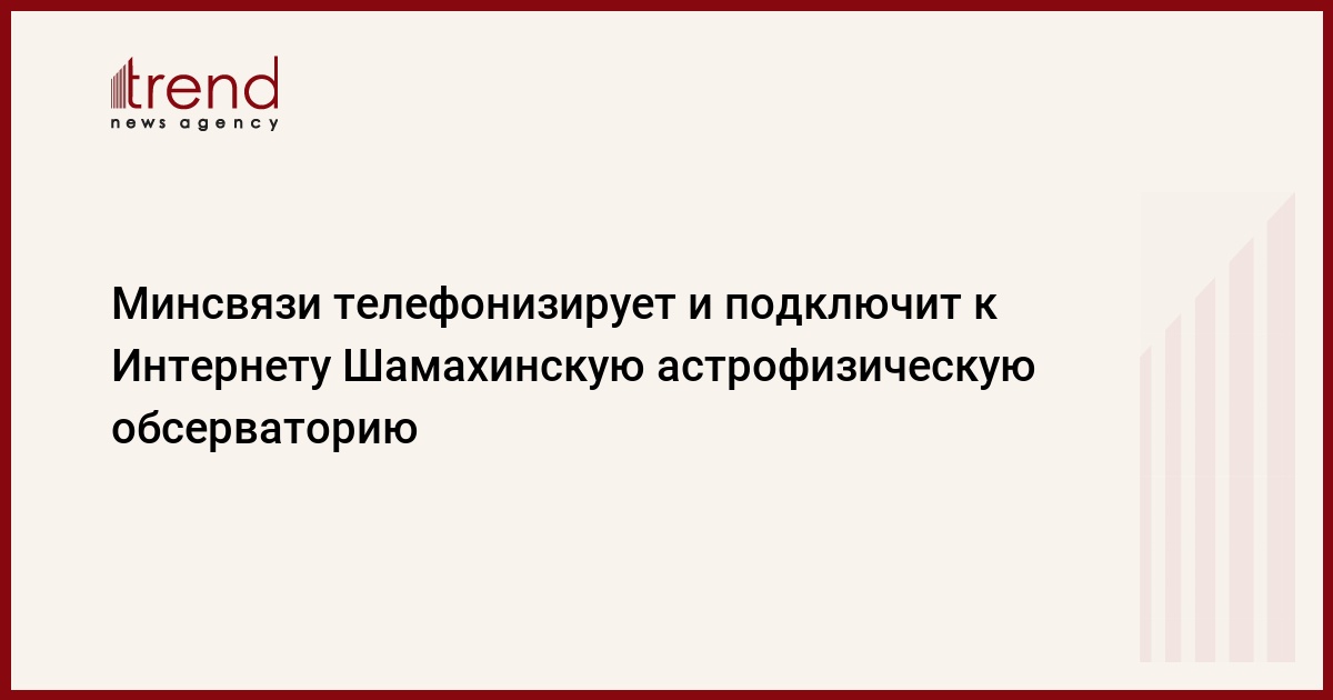 Азербайджан, Баку, 8 сентября /корр. Trend С.Бабаева/ Министерство связи и информационных технологий Азербайджана телефонизирует Шамахинскую астрофизическую обсерваторию имени Насиреддина Туси Национальной академии наук Азербайджана и подключит ее к сети скоростного Интернета. Об этом говорится в распоряжении президента Азербайджана Ильхама Алиева, передает пресс-служба минсвязи.