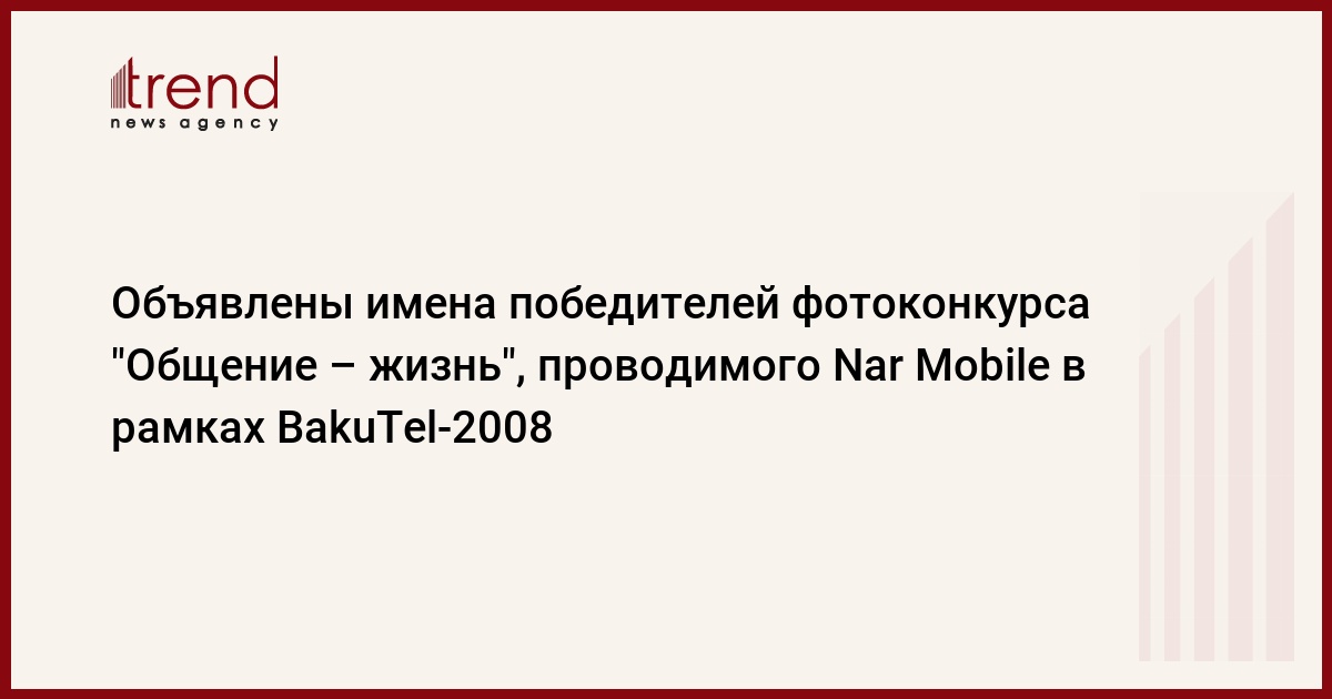 объявил результаты фотоконкурса "Общение - жизнь", проведенного в рамках выставки BakuTel 2008. Azerfon (торговая марка Nar Mobile) является генеральным спонсором BakuTel-2008.