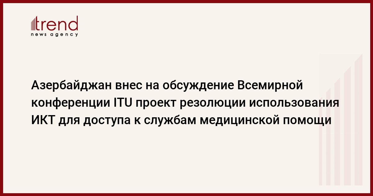 Азербайджан внес в общие предложения регионального содружества связи (РСС) проект новой резолюции "Обеспечение лучшего доступа к службам медицинской помощи путем использования информационно-коммуникационных технологий", который будет обсужден в рамках Всемирной конференции по развитию электросвязи ITU-2010, говорится в сообщении регионального содружества связи (РСС).