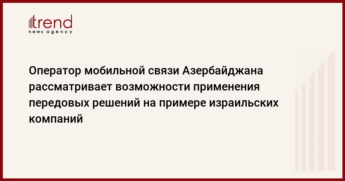 По словам Фарзалиева, с этой целью Израиль посетили технические специалисты компании, основной целью визита которых было ознакомление с рынком мобильных технологий этой страны и опытом внедрения передовых решений в сфере мобильной связи с перспективой их дальнейшего внедрения на телекоммуникационном рынке Азербайджана.