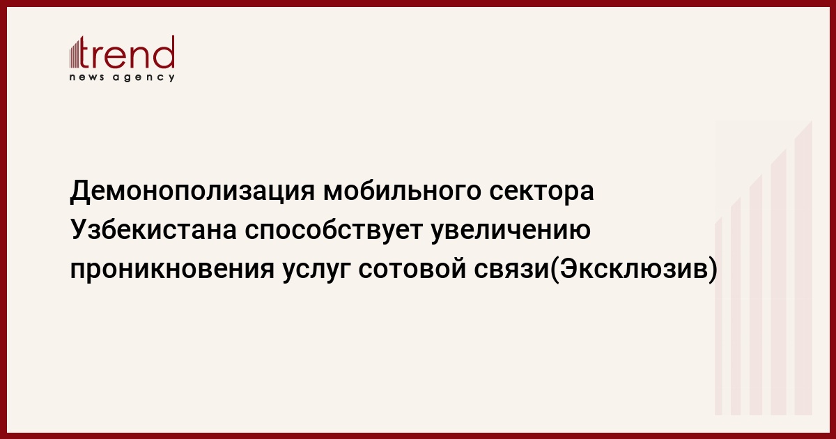 БАКУ /Trend/ - Ключевую роль в увеличении проникновения мобильной связи в Узбекистане сыграет демонополизация отрасли, и значительные инвестиции в расширение международного канала, сообщила Trend советник по связям с общественностью мобильного оператора Beeline Uzbekistan Мадина Рузматова.