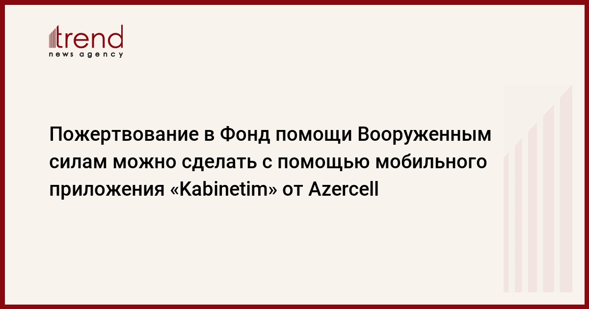 Компания Azercell тоже создает для своих абонентов возможность делать пожертвования в Фонд помощи Вооруженным силам в более удобной и быстрой форме.Посредством приложение Azercell «Kabinetim» («Мой кабинет») в любое время суток в режиме 24/7 можно переводить средства в Фонд. Для этого достаточно запустить приложение «Kabinetim» и в разделе «Mobil Ödəmə» («Мобильная Оплата») выбрав операцию «Orduya ianə» («Пожертвовать армии») произвести оплату. Для перечисления суммы нет необходимости в кредитной карте, баланс данного номера должен составлять как минимум 3 азн. Разовая сумма для пожертвования может составить 50 манатов, тогда как месячный лимит для данной услуги составляет 500 азн.