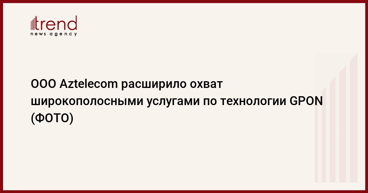 БАКУ /Trend/ - ООО Aztelecom начало оказывать широкополосные услуги по технологии GPON (Gigabit Passive Optical Network) в селе Ивановка и поселке Лагич Исмаиллинского района.