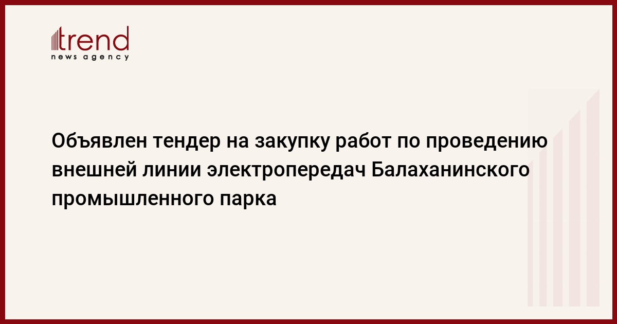 БАКУ /Trend/ - ОАО "Təmiz Şəhər" ("Чистый город") объявило открытый тендер на закупку работ по проведению внешней линии электропередач Балаханинского промышленного парка.
