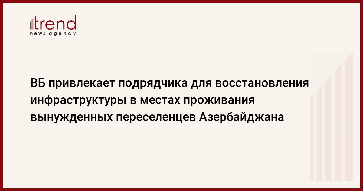 Тендер объявлен в рамках дополнительного финансирования ВБ, предоставленного правительству Азербайджана на поддержку жилищных условий и доходов вынужденных переселенцев. Часть этих средств планируется направить на реализацию инфраструктурных проектов в жилых поселках, где проживают общины вынужденных переселенцев.