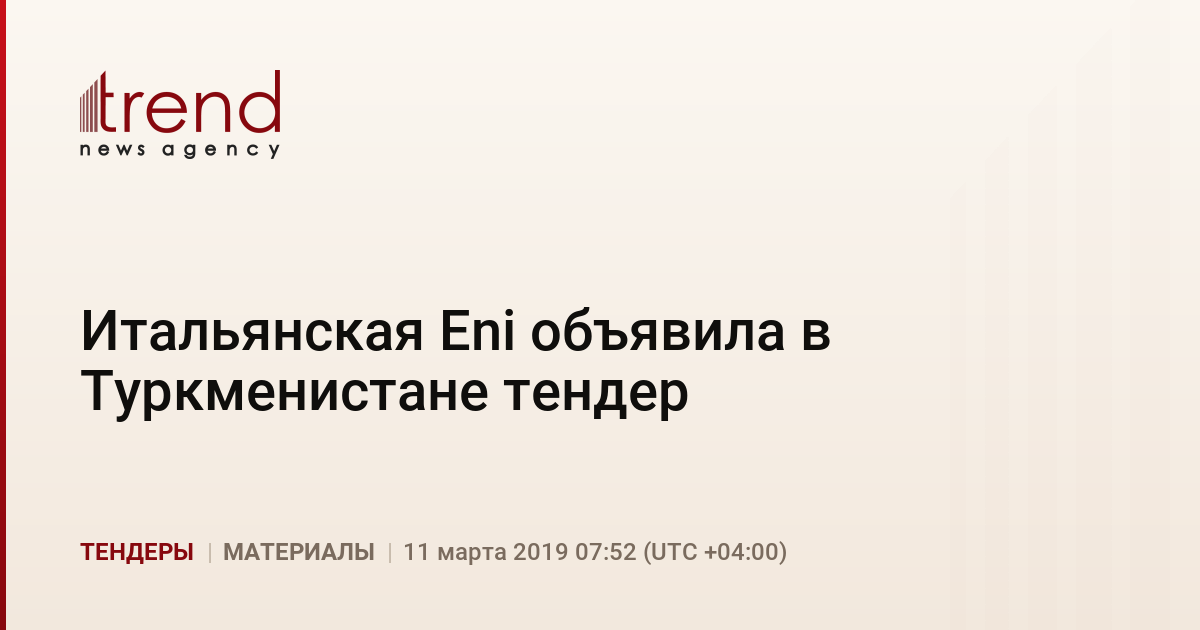 АШХАБАД /Trend/ - Eni Turkmenistan Ltd объявляет тендер на поставкуна поставку химической продукции.