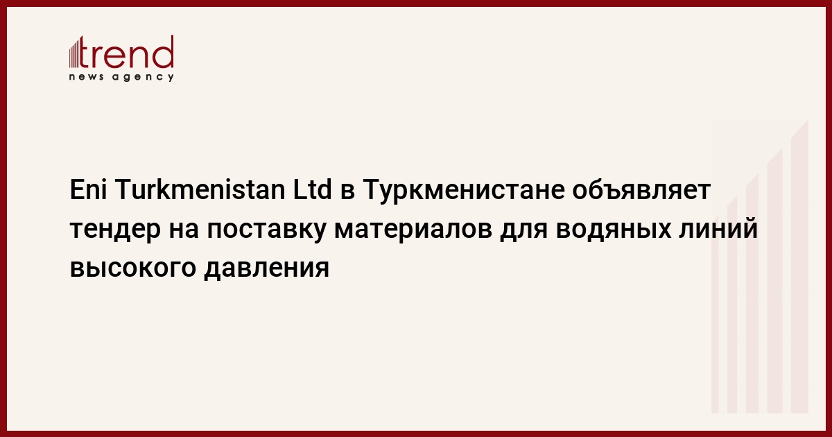 БАКУ/Trend/ - Компания Eni Turkmenistan Ltd в Туркменистане объявляет тендер на закупку материалов для водяных линий высокого давления.