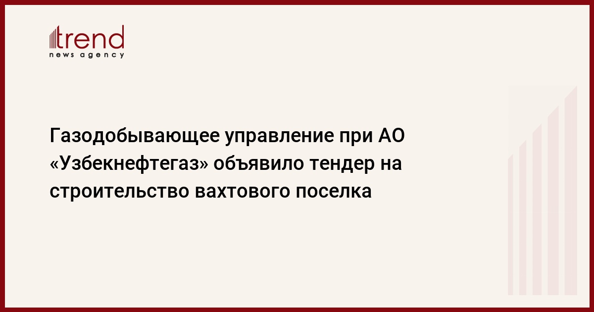 БАКУ /Trend/ - Устюртское газодобывающее управление при АО «Узбекнефтегаз» объявляет тендер на строительство вахтового поселка на 50 мест на месторождении «Урга» в Кунградском районе Республики Каракалпакстан.