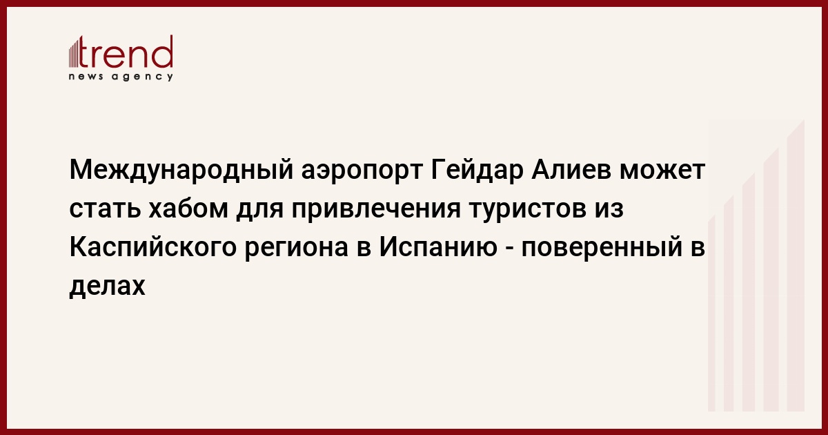БАКУ /Trend/ - Международный аэропорт Гейдар Алиев, находящийся в Баку, столице Азербайджана, может служить хабом для привлечения туристов из Каспийского региона в Испанию, сказал Trend временный поверенный в делах Испании в Баку Игнасио Санчес Табоада.