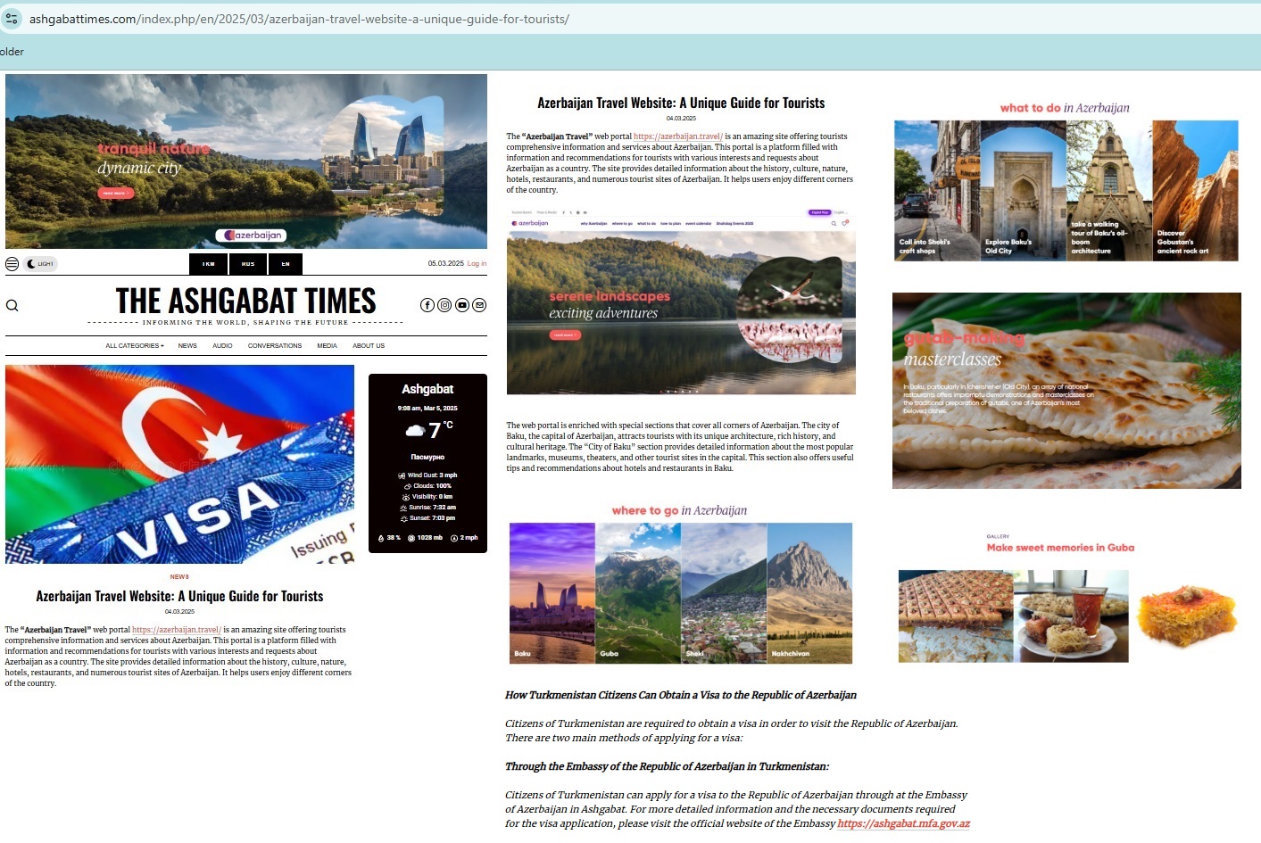 В данном материале, опубликованном на туркменском, английском и русском языках,представлена подробная информация о платформе Azerbaijan.Travel. В публикации представлены сведения о туристических возможностях Азербайджана, маршрутах, истории и достопримечательностях страны. Кроме того, на главной странице портала ashgabattimes.com размещён баннер туристического сайта Azerbaijan.Travel в виде гиперссылки.
