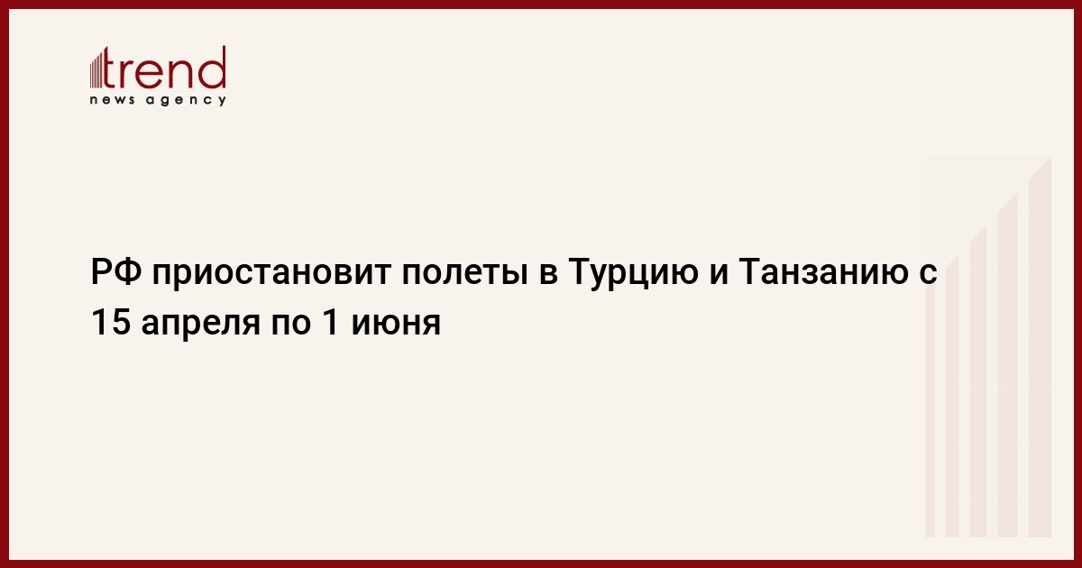 Россия с 15 апреля по 1 июня приостанавливает регулярные рейсы и полеты чартеров в Турцию, а также авиасообщение с Танзанией. Об этом, как передает Trend со ссылкой на Интерфакс сообщила вице-премьер РФ Татьяна Голикова.