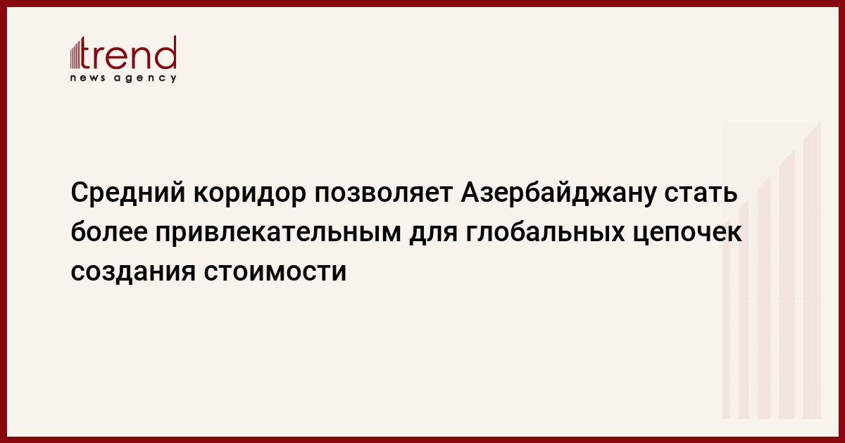 «Большая часть торговли между Китаем и Европой происходила через Северный коридор, который в конечном итоге проходит через Россию. А теперь, из-за войны в Украине и санкций против России, значительная часть этой торговли смещается в сторону Среднего коридора, который, по сути, проходит через Среднюю Азию и Кавказ, опять же связывая Китай с Европой. Географическое положение на торговом пути Восток-Запад, соединяющем Европу и Китай, открывает перед Азербайджаном множество возможностей. Первый, конечно же, связан с транзитными перевозками. Транспорт и логистика, спрос на услуги в этой сфере могут способствовать экономическому росту в Азербайджане. Стратегическое расположение на маршруте Среднего коридора также позволяет Азербайджану стать более привлекательным для глобальных цепочек создания стоимости и лучше интегрироваться в глобальные цепочки создания стоимости», — сказал он.