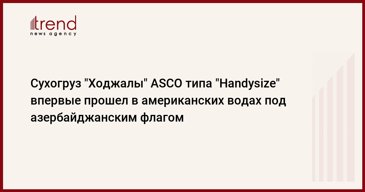 БАКУ/Trend/ - ЗАО "Азербайджанское каспийское морское пароходство" ASCO) сообщило о том, что первый сухогруз ASCO типа "Handysize" под названием "Ходжалы" впервые прошел в американских водах под азербайджанским флагом, сообщает в субботу Trend.