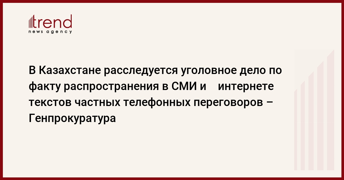 Комитет национальной безопасности (КНБ) Казахстана возбудил и расследует уголовное дело по факту распространения в ряде СМИ и интернете текстов частных телефонных разговоров высокопоставленных должностных лиц, сообщила в четверг генеральная прокуратура республики, передает Интерфакс-Казахстан.