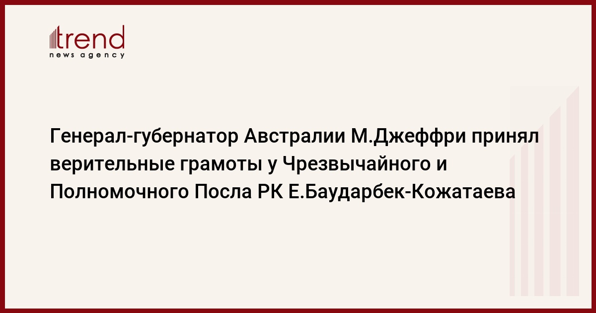 Казахстан, Алматы, 31 августа Trend Р.Мешадигасанлы/ Генерал-губернатор Австралии М.Джеффри принял верительные грамоты у Чрезвычайного и Полномочного Посла РК Е.Баударбек-Кожатаева, сообщает пресс-служба МИД Казахстана.