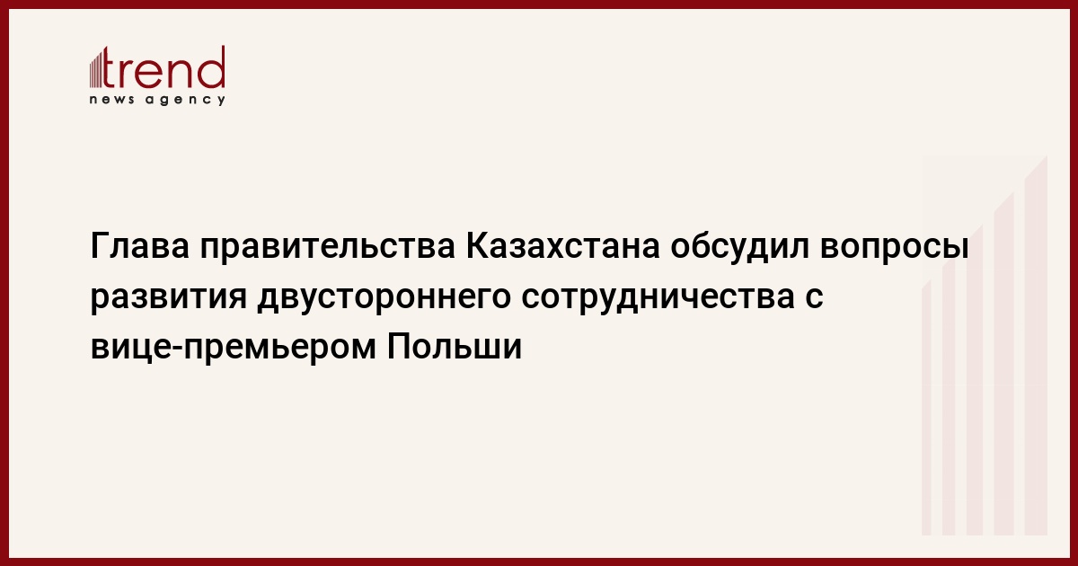 Глава правительства Казахстана Карим Масимов в пятницу обсудил вопросы развития двустороннего сотрудничества с вице-премьером - министром экономики Польши Вальдемаром Павляком, сообщает КазТАГ со ссылкой на пресс-службу премьера.