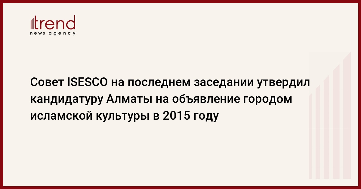Совет ISESCO на последнем заседании утвердил кандидатуру Алматы на объявление городом исламской культуры в 2015 году. Об этом в ходе встречи с послом Казахстана в Каире Бахтияром Тасымовым заявил генеральный директор ISESCO (Исламская организация по вопросам образования, науки и культуры) Абдель Азиз Ат-Туэйджри, сообщил Trend пресс-секретарь МИД РК Ильяс Омаров.