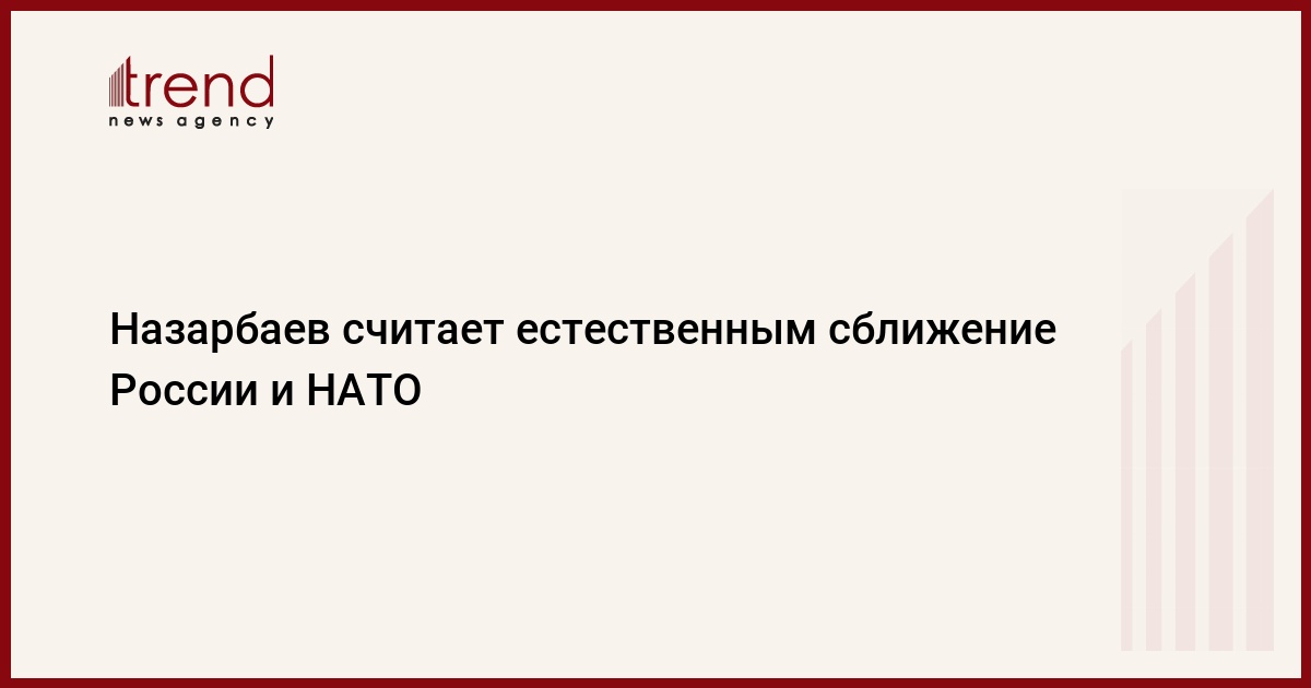 Президент Казахстана Нурсултан Назарбаев считает, что сближение РФ и НАТО было естественным и надо воспринимать это как положительный фактор, сообщает РИА Новости.