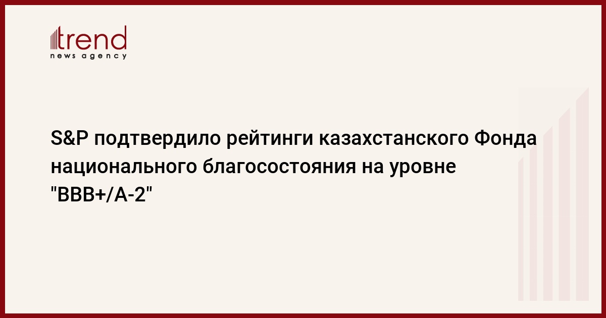 В соответствии с критериями присвоения рейтингов организациям, связанным с государством, агентство приравнивает рейтинги АО "Фонд национального благосостояния "Самрук-Казына" (АО "Самрук-Казына") к кредитным рейтингам Республики Казахстан (рейтинги по обязательствам в иностранной валюте: BBB+/Стабильный/A-2; по обязательствам в национальной валюте: BBB+/Стабильный/A-2; рейтинг по национальной шкале: kzAAA).