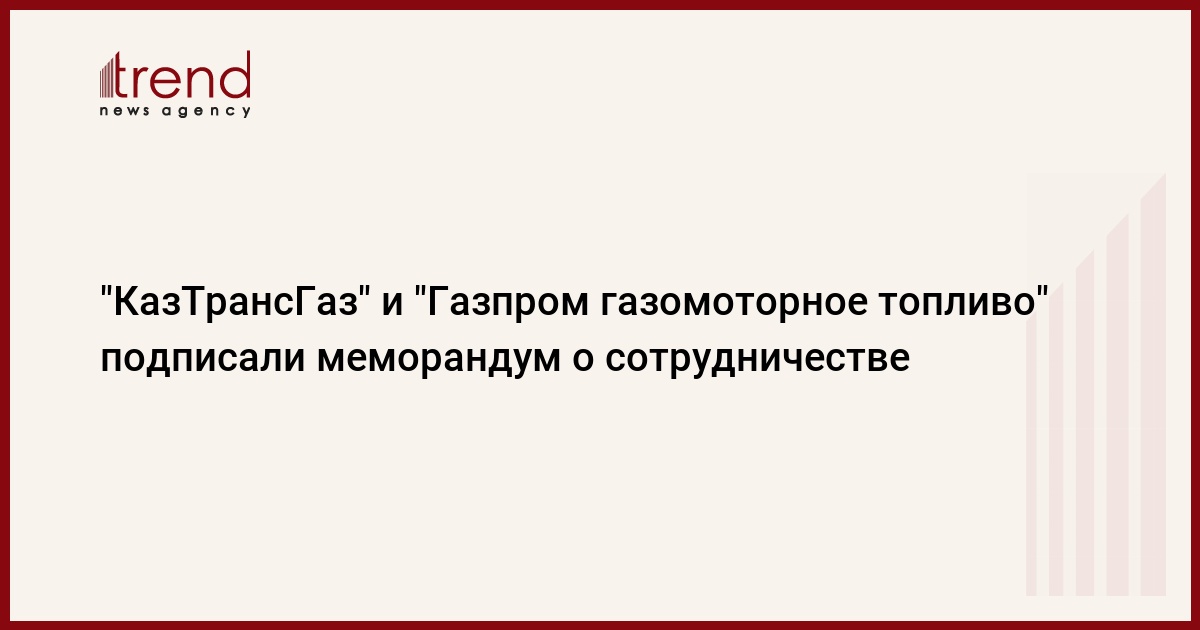 АО "КазТрансГаз" (КТГ) и "ООО "Газпром газомоторное топливо" подписали меморандум о сотрудничестве в области использования природного газа в качестве моторного топлива, сообщает в четверг пресс-служба "КазТрансГаза".