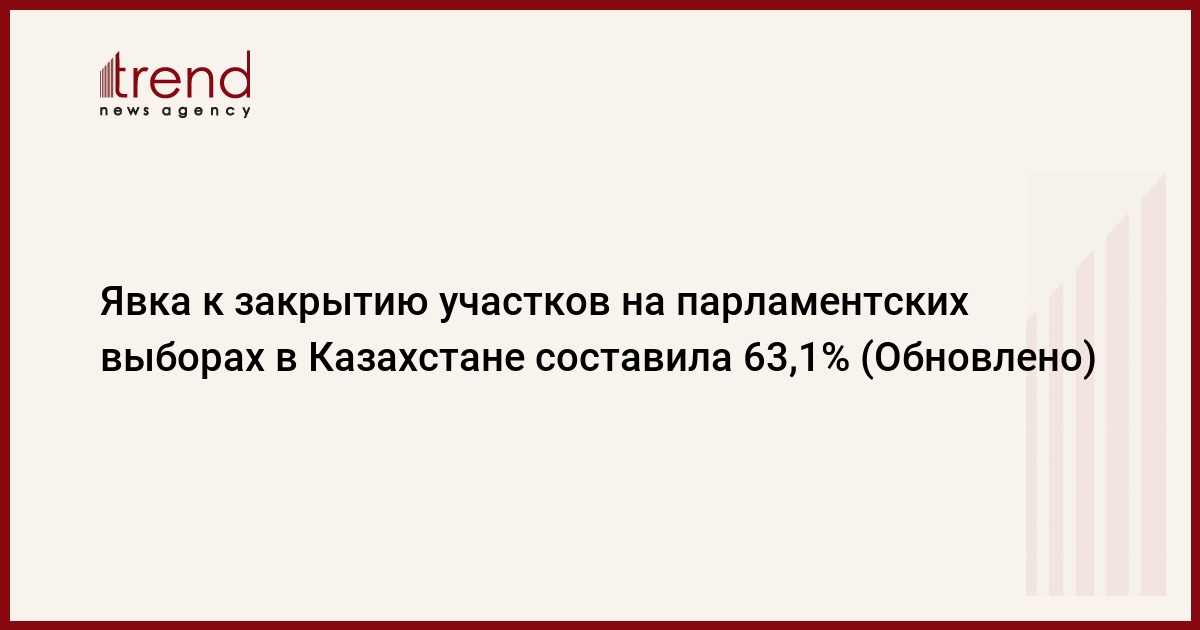 Явка на момент закрытия в 20:00 (17:00 мск) большей части избирательных участков на проходящих в воскресенье в Казахстане выборах депутатов Мажилиса (нижней палаты) парламента составила 63,1%. Об этом сообщила на брифинге секретарь Центральной избирательной комиссии Сабила Мустафина, передает Trend со ссылкой на ТАСС.