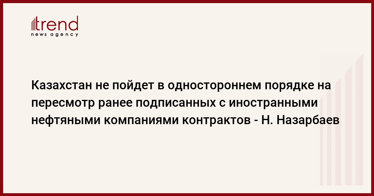 (КАЗИHФОРМ) Казахстан будет твердо придерживаться принятых на себя обязательств и в одностороннем порядке не пойдет на пересмотр ранее подписанных с иностранными нефтяными компаниями контрактов, заявил Президент Hурсултан Hазарбаев на встрече 21 октября с главами дипломатических миссий.