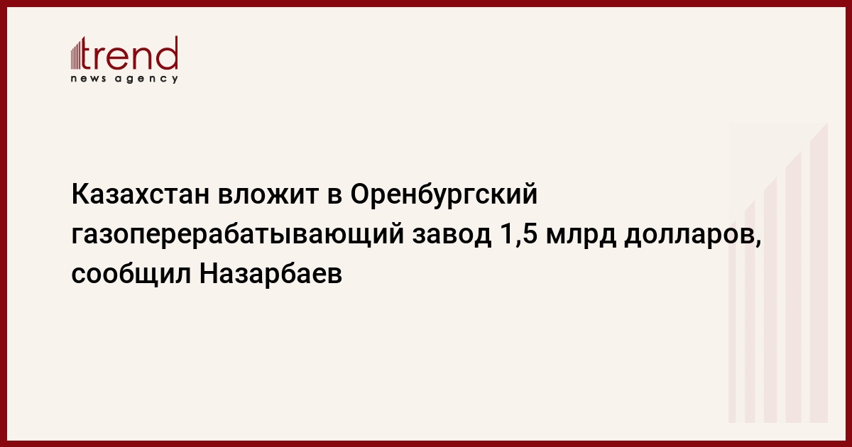 Казахстан вложит в Оренбургский газоперерабатывающий завод 1,5 млрд долларов, передает Trend со ссылкой на ИТАР-ТАСС. Об этом сообщил сегодня лидер Казахстана Hурсултан Hазарбаев на пресс-конференции после переговоров с президентом РФ и подписания соглашений, в том числе о совместной разработке Карачаганакского газового месторождения.