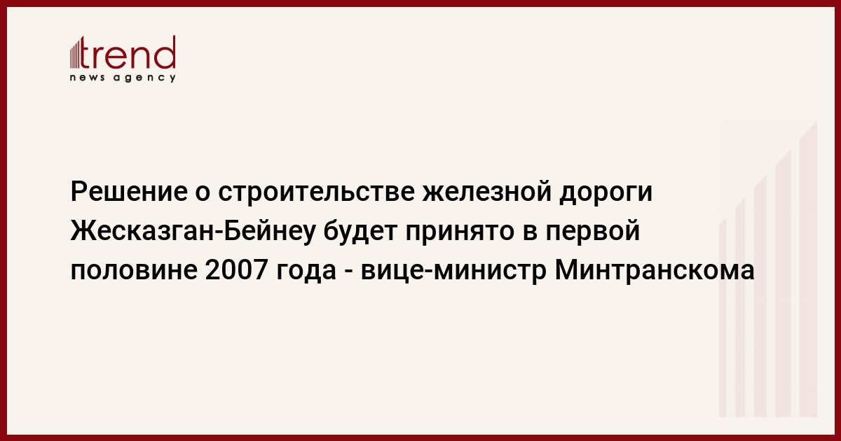 "В течение первой половины 2007 года будет сделан детальный анализ строительства этой ветки и разработано технико-экономическое обоснование. На основе этих данный будет, во-первых, выбран маршрут строительства магистрали от Бейнеу до Жезказгана и, во вторых, решен механизм финансирования проекта".