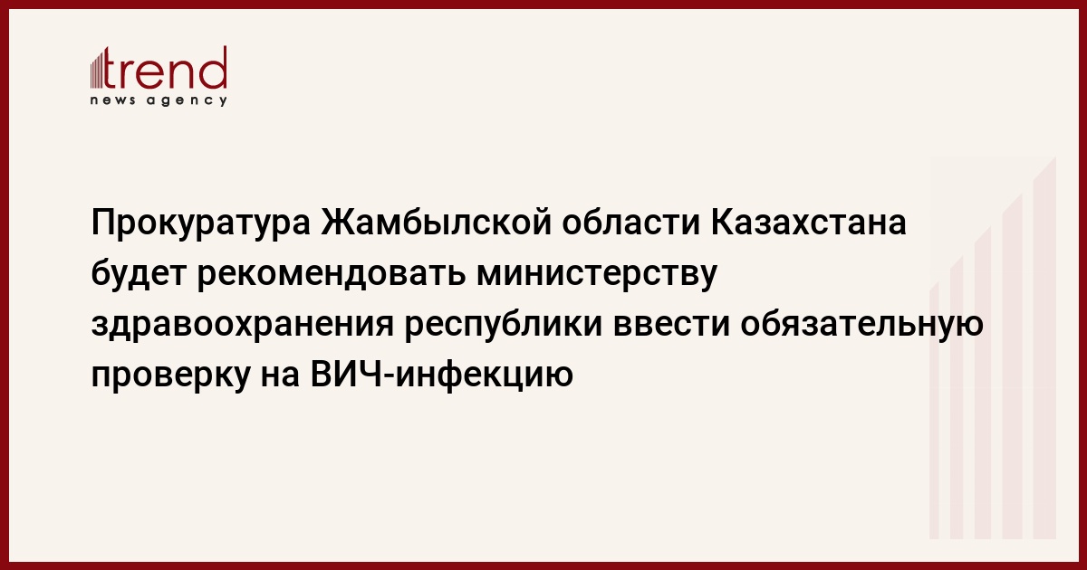 Как передает Trend со ссылкой на ИНТЕРФАКС-КАЗАХСТАН В частности, отметила она, прокуратура Жамбылской области намерена рекомендовать министерству здравоохранения в законодательном порядке закрепить обязательную сдачу анализов на ВИЧ/СПИД медицинскими работниками каждые полгода.