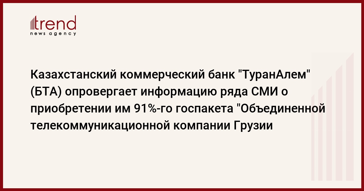 Казахстанский коммерческий банк "ТуранАлем" (БТА) опровергает информацию ряда СМИ о приобретении им 91%-го госпакета "Объединенной телекоммуникационной компании Грузии" (бывшая "Электросвязь Грузии", крупнейший в стране оператор городской и междугородной телефонной связи), сообщает собкор Trend в Астане.