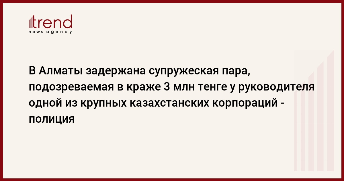 В Алматы задержана супружеская пара, подозреваемая в краже 3 млн тенге (текущий 123,95/$1) у руководителя одной из крупных казахстанских корпораций, сообщили в четверг агентству "Интерфакс-Казахстан" в пресс-службе Юго-Восточного департамента внутренних дел на транспорте (ЮВДВДТ).
