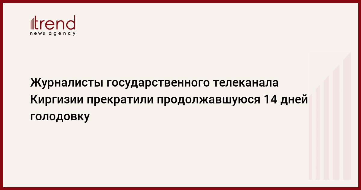 Журналисты национальной телерадиокомпании /НТРК/ Киргизии согласились сегодня прекратить продолжавшуюся 14 дней голодовку. Об этом сообщил гендиректор компании Мелис Эшимканов после переговоров с ними, передает ИТАР-ТАСС .