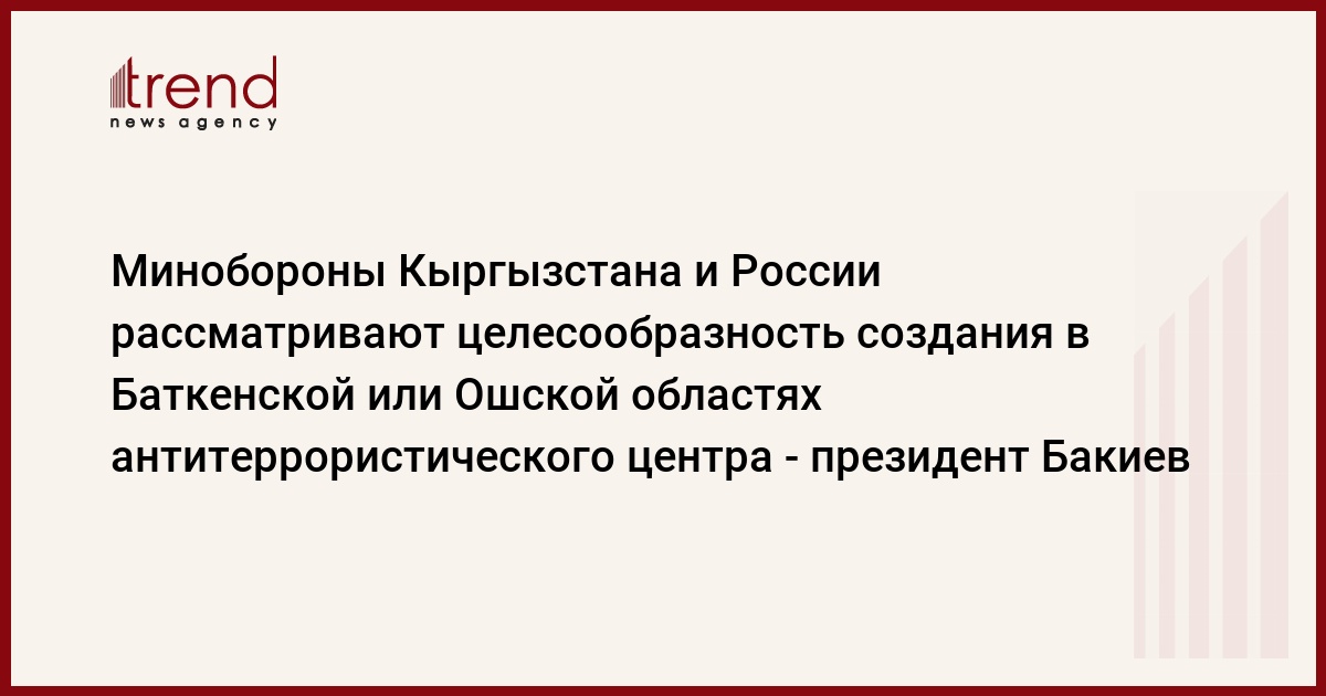Министерства обороны Кыргызстана и России изучают вопрос целесообразности создания в Баткенской или Ошской областях антитеррористического центра. Об этом в интервью влиятельной американской газете "Нью-Йорк таймс" заявил президент Кыргызстана Курманбек Бакиев, сообщает ИА "24.kg".