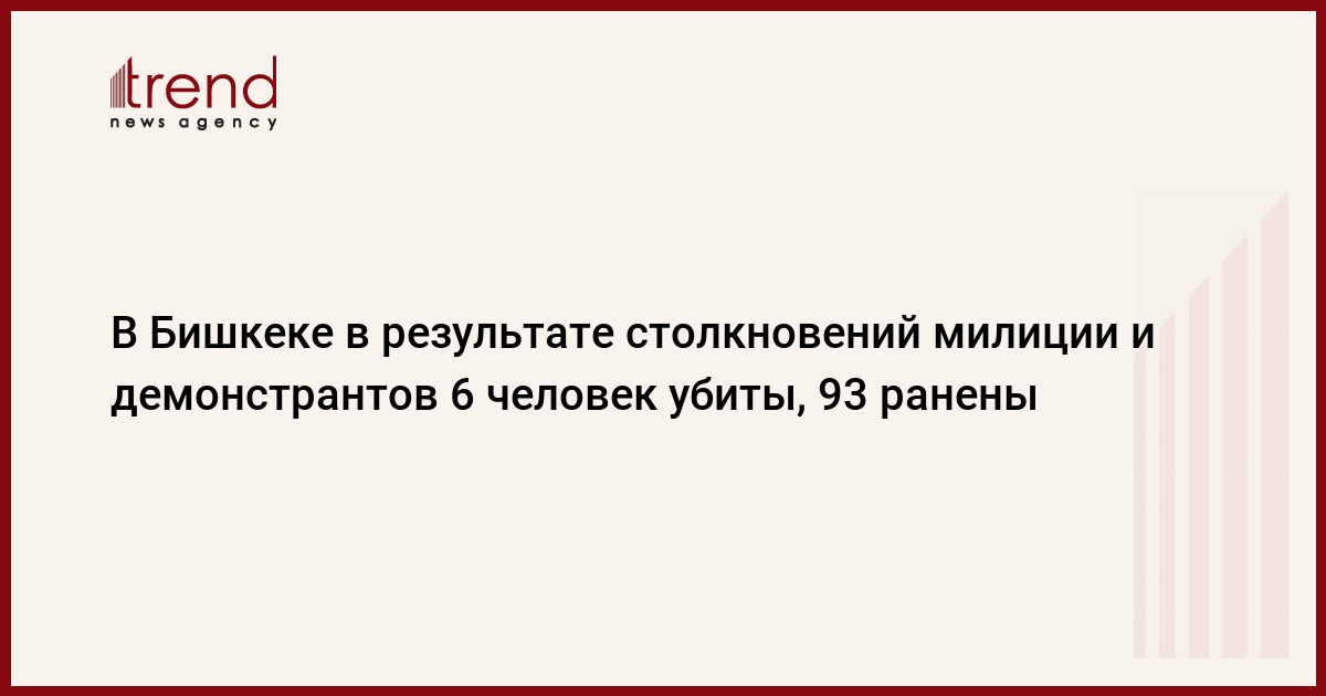 Во время столкновений демонстрантов и сотрудников милиции на центральной площади Бишкека возле здания Дома правительства сегодня, по информации из различных источников, убиты 6 человек и еще 93 получили ранения.