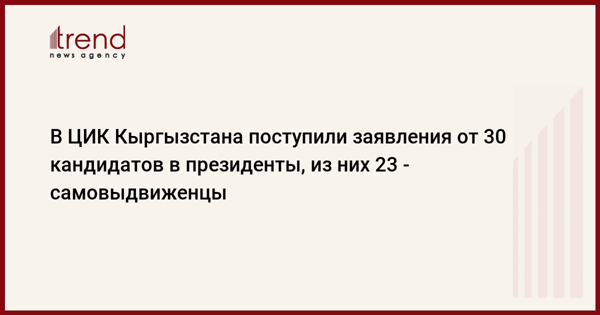 По состоянию на 2 августа 2011 года в Центральную комиссию по выборам и проведению референдумов Кыргызстана поступили заявления от 30 кандидатов на должность президента КР, из них 23 - самовыдвиженцы, пишет CA-News.