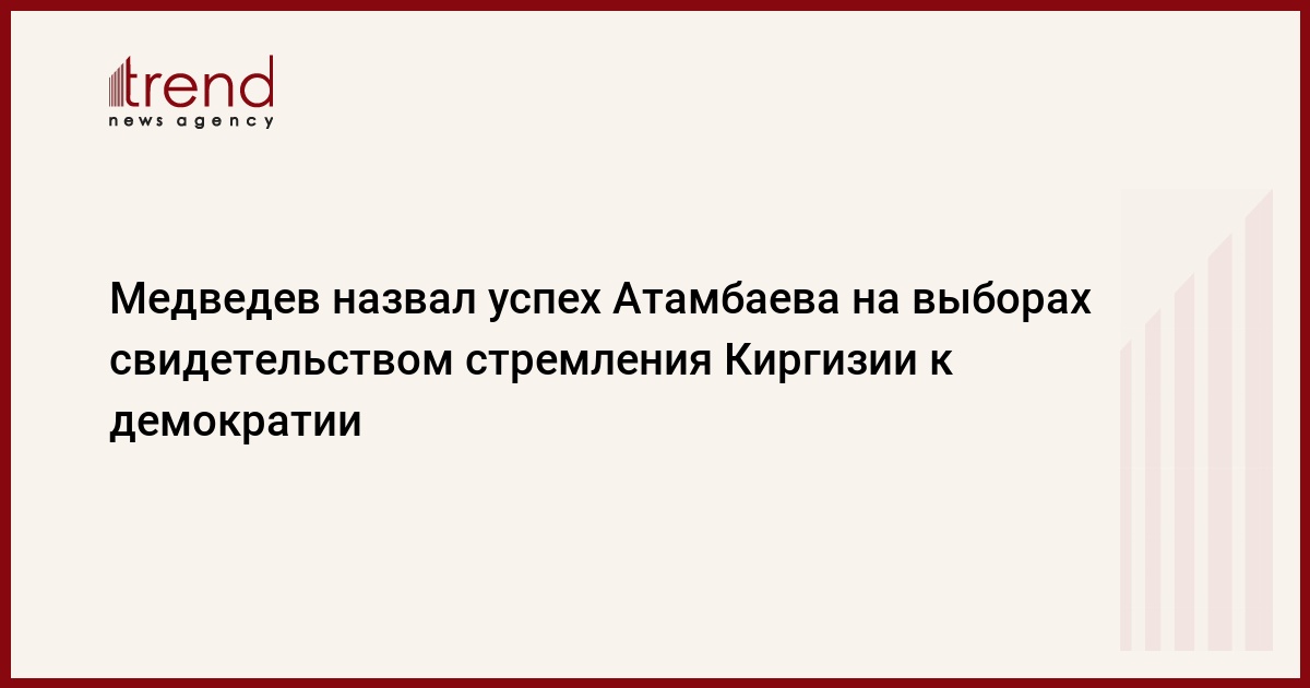 Медведев в телеграмме отметил, что успех Атамбаева - это "свидетельство стремления киргизского народа к демократии и социально-экономической стабильности", сообщает РИА Новости.