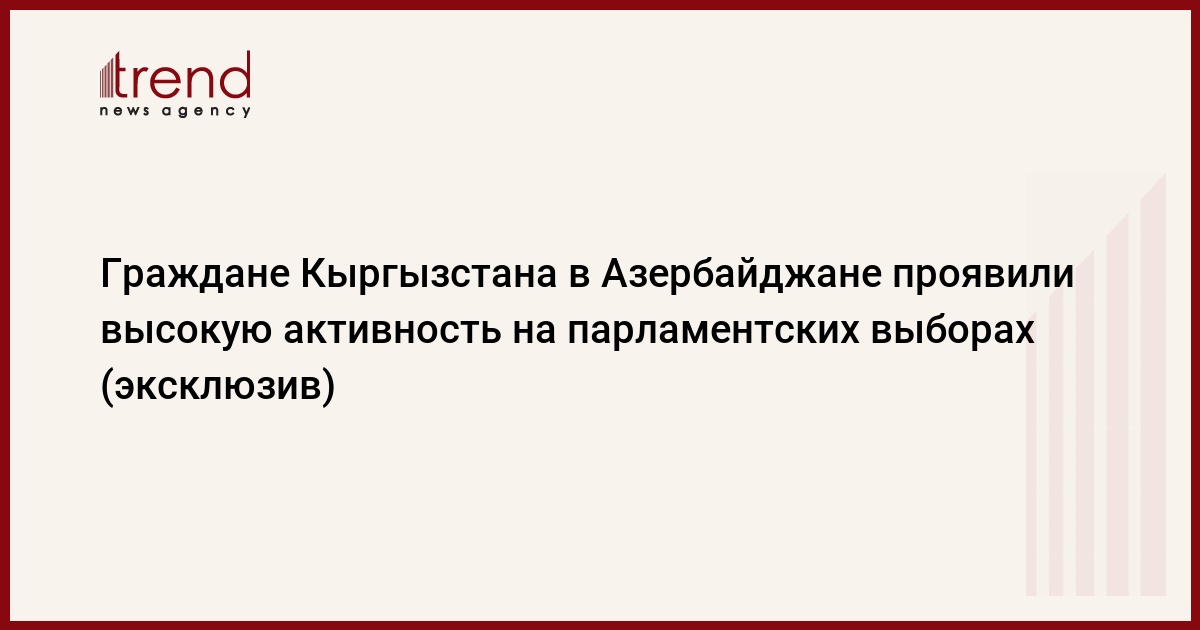БАКУ /Trend/ - На выборах в Жогорку Кенеш (парламент) Кыргызстана, прошедших четвертого октября, на избирательном участке в Баку проголосовал 31 человек, или 91,7 процента из общего числа избирателей, находящихся в Азербайджане. Об этом сообщил в эксклюзивном интервью Trend посол Кыргызстана в Азербайджане Айджигит Буранов.
