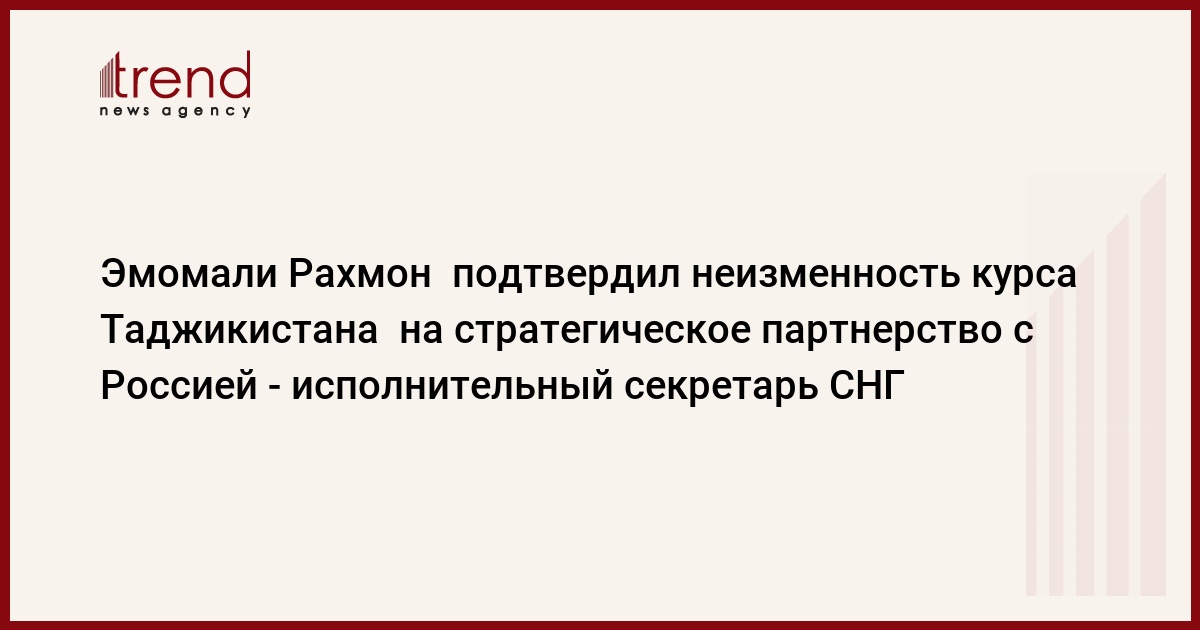 "Президент Таджикистана подчеркнул приверженность руководства республики интеграционному сотрудничеству в рамках Содружества и укреплению стратегического партнерства с Россией",- указал Лебедев. "Курс Таджикистана на сохранение дружественных стратегических отношений с Россией неизменен, также неизменно активное участие нашей страны в Содружестве независимых государств",- процитировал он слова таджикского руководителя, добавив, что ему "как главе Исполкома СНГ слышать эти слова президента Таджикистана было приятно".