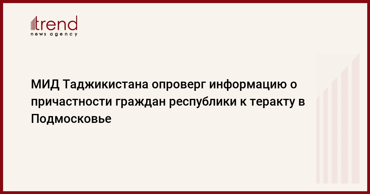 БАКУ /Trend/ - МИД Таджикистана опроверг информацию о причастности граждан республики к теракту в Подмосковье, передает в субботу Trend со ссылкой на внешнеполитическое ведомство страны.