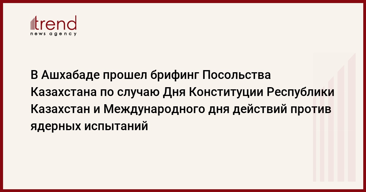 28 августа 2013 года в г.Ашхабад состоялся брифинг Посольства Республики Казахстан в Туркменистане по случаю празднования 18-летия принятия Конституции Республики Казахстан и Международного дня действий против ядерных испытаний, сообщает пресс-служба МИД РК.