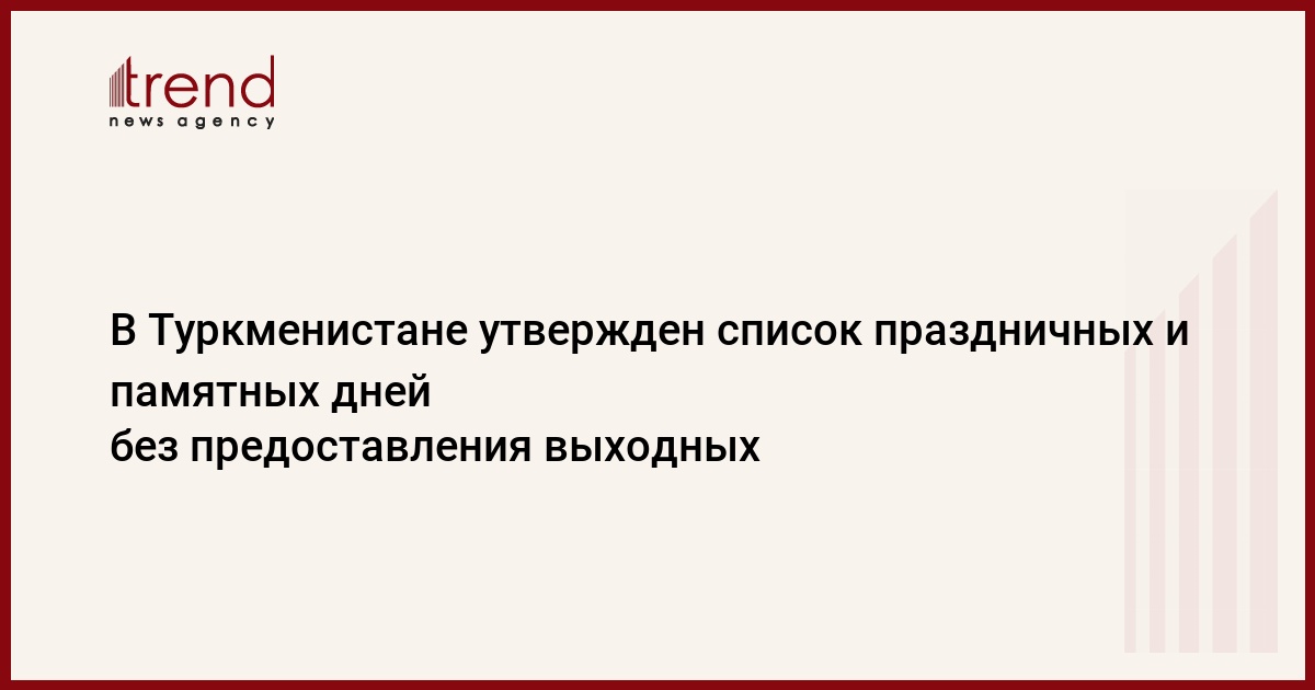 В документе подчеркивается, что при совпадении упомянутых в первом пункте данного указа знаменательных дат с другим праздничным днем один из них может быть перенесен соответствующим актом президента Туркменистана. (Автор: Гусейн Гасанов. Редактор: Константин Шапиро)