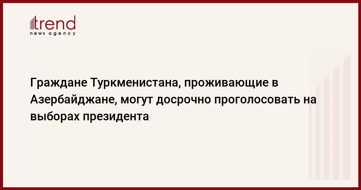Для граждан Туркменистана, временно и постоянно проживающих в Азербайджане, которые не имеют возможности принять участие в голосовании на выборах президента Туркменистана в день выборов 12 февраля 2017 года, избирательный участок при посольстве Туркменистана в Баку для досрочного голосования будет открыт с 02 февраля 2017 года.