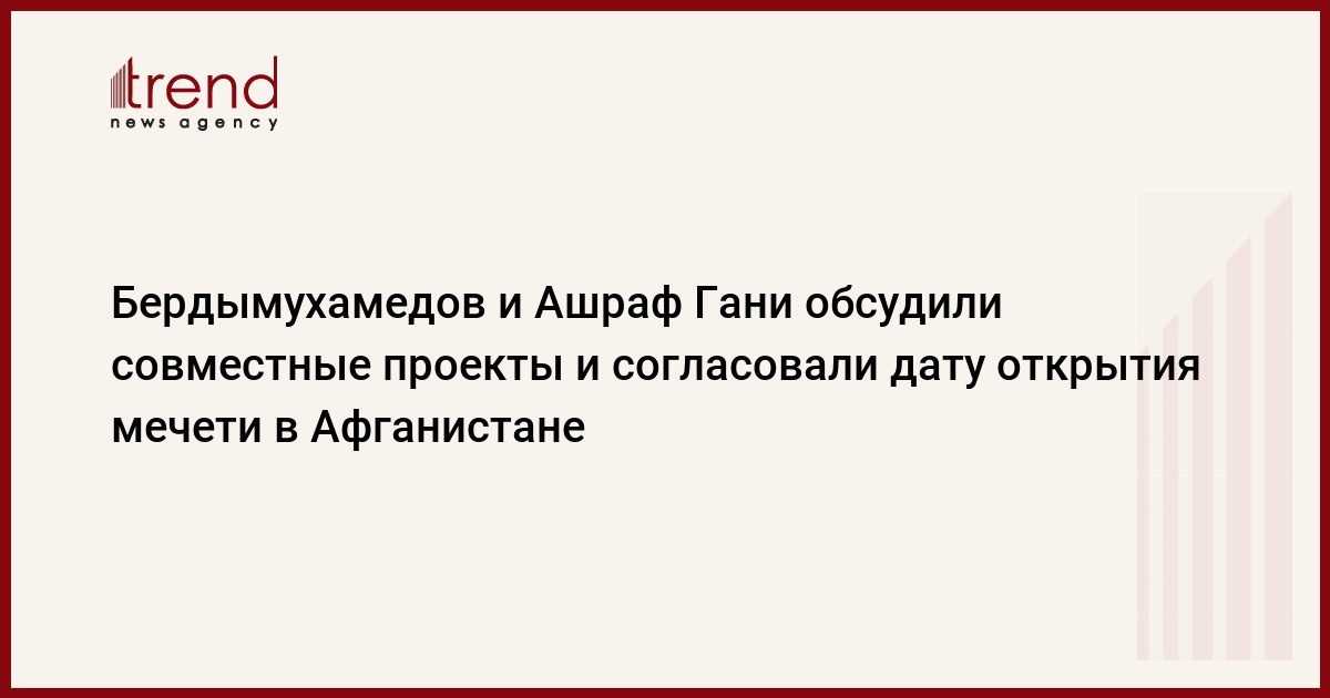 Реализацию совместных инфраструктурных проектов и предстоящее открытие в Афганистане построенной на средства Туркменистана мечети обсудили сегодня в ходе телефонного разговора лидеры двух стран Гурбангулы Бердымухамедов и Мохаммад Ашраф Гани, сообщила информационная программа «Ватан» туркменского телевидения, передает Trend со ссылкой на Туркменистан Сегодня.