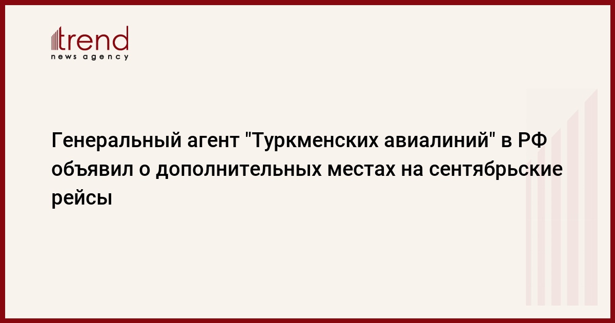 Представитель генерального агента авиакомпании "Туркменистан" в России объявил о дополнительных местах на рейсы маршрута Ашхабад-Казань на сентябрь месяц. Эта информация предоставлена на официальном сайте представительства "Туркменских авиалиний" в Российской Федерации, сообщает Trend.