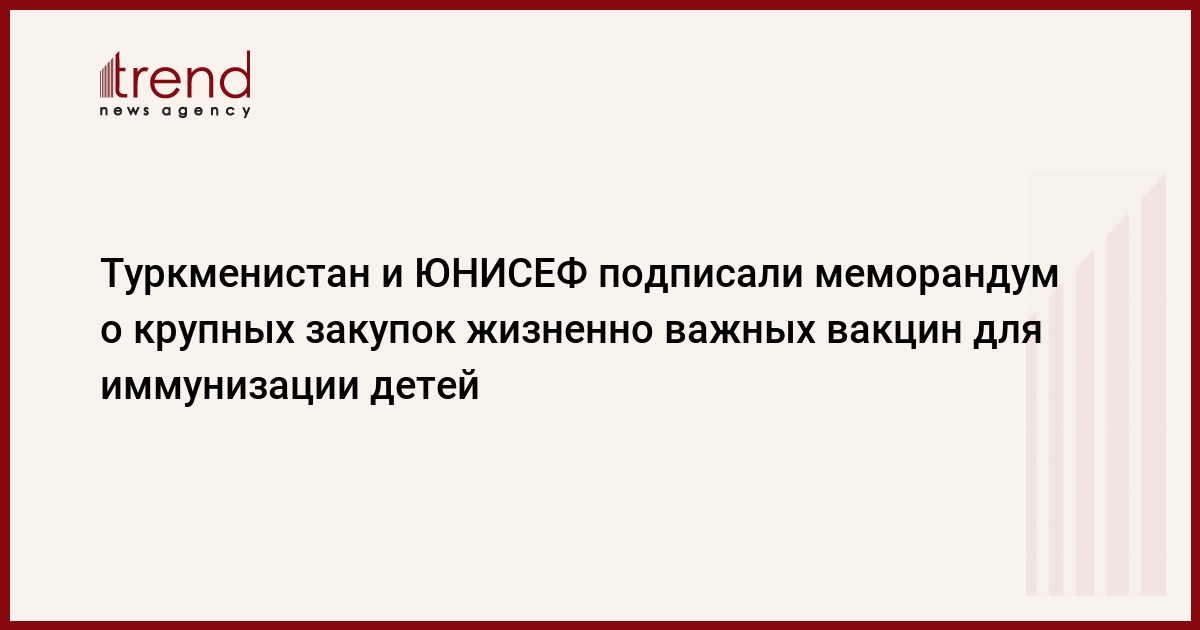 Туркменистан и ЮHИСЕФ подписали меморандум о закупке жизненно важных вакцин, лекарств и других медицинских товаров для профилактики детей от вакцино-управляемых инфекций, передает Trend . "ЮHИСЕФ поставит качественные вакцины и оборудование по приемлемой цене через один из самых крупных закупочных центров в Копенгагене," - сказал сегодня представитель ЮHИСЕФ в Туркменистане Махбуб Шариф, комментируя значение подписанного на днях Меморандума о Взаимопонимании между правительством Туркменистана и ЮHИСЕФ.
