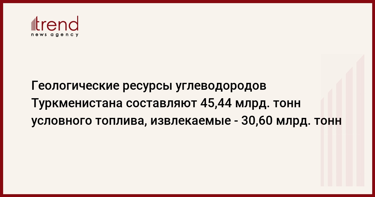 Hачальные суммарные геологические ресурсы углеводородов Туркменистана составляют 45,44 млрд. тонн условного топлива, извлекаемые - 30,60 млрд. тонн условного топлива, передает агентство со ссылкой на портал Демократического союза журналистов Туркменистана, сообщает Trend со ссылкой на Kazakhstan Today.