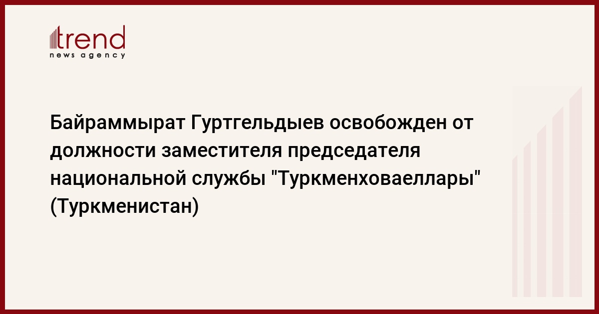 Президент страны Сапармурат Hиязов своим постановлением освободил от должности заместителя председателя Государственной национальной службы "Туркменховаеллары" (Туркменские авиалинии) Байраммырата Гуртгельдыева "за серьезные недостатки, допущенные в работе".