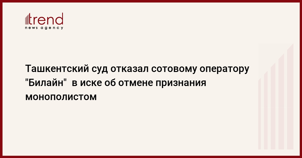 Ташкентский городской хозяйственный суд в среду отказал в удовлетворении иска ООО Unitel, дочернему предприятию российского "Вымпелкома" (торговая марка "Билайн") к Государственному комитету по приватизации, демонополизации и развитию конкуренции (Госкомконкуренции) Узбекистана о признании недействительным решения регулятора о доминирующем положении оператора на рынке сотовой связи, сообщил Trend в среду представитель компании.
