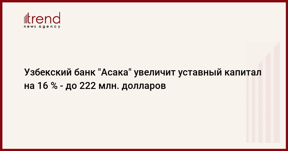 Как сообщалось, в декабре 2013 года банк "Асака" выпустил 1 миллион 226,698 тысячи простых акций номиналом 61,14 тысячи сумов каждая на общую сумму 75 миллиардов сумов, планируя увеличить уставный капитал на 18 процентов - до 494,88 миллиарда сумов. Размещение ценных бумаг было предусмотрено способом закрытой подписки среди - ОАО "Алмалыкский ГМК", ГП "Навоийский ГМК", ГАЖК "Узбекистон темир йуллари", НХК "Узбекнефтегаз", АК "Узбектелеком", ГАК "Узбекэнерго" и ОАО "Узметкомбинат" в течение 150 календарных дней.